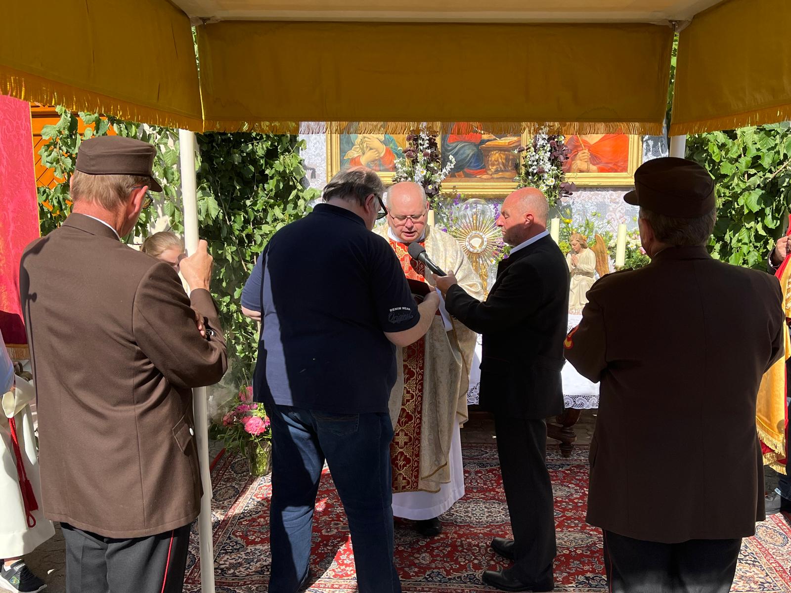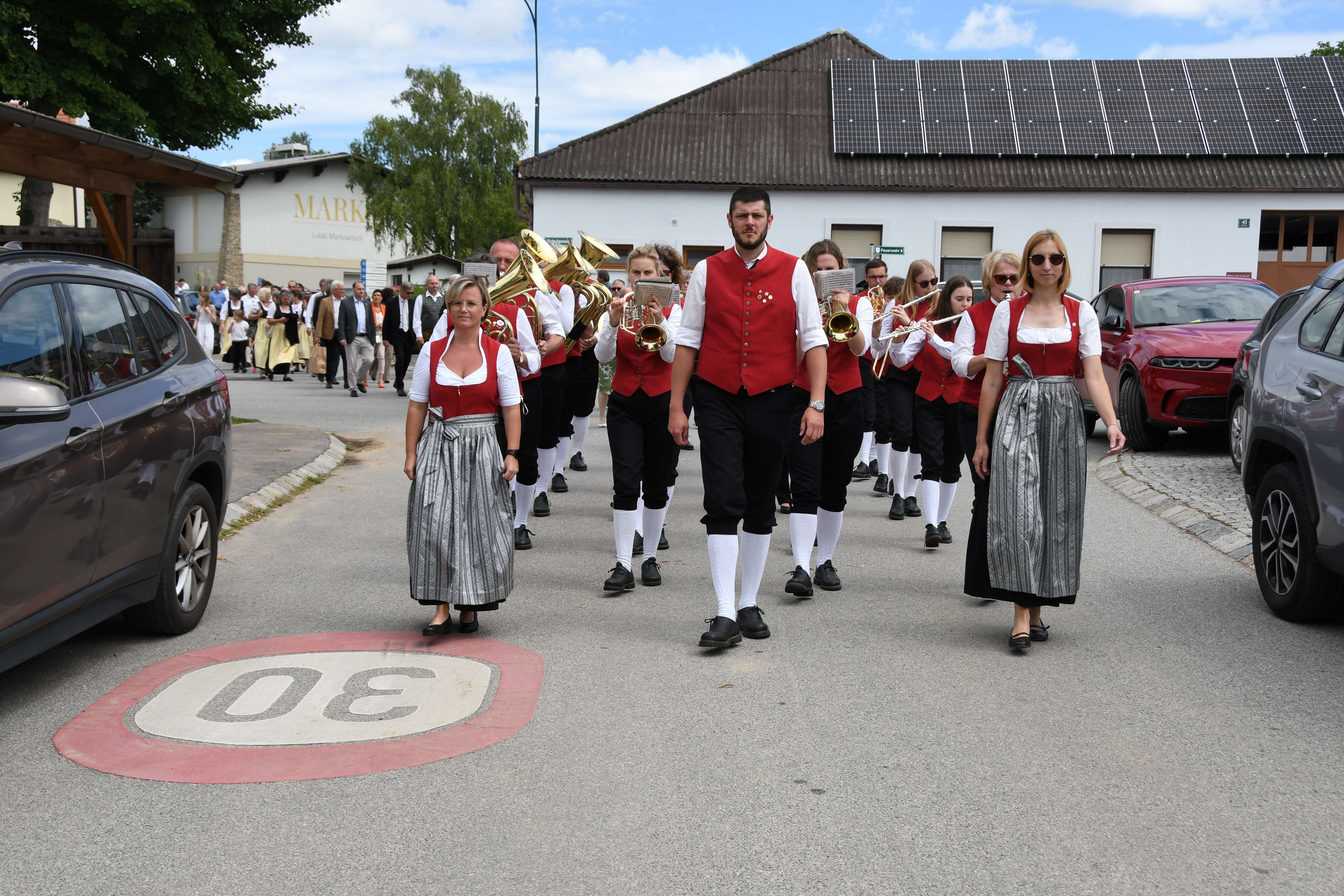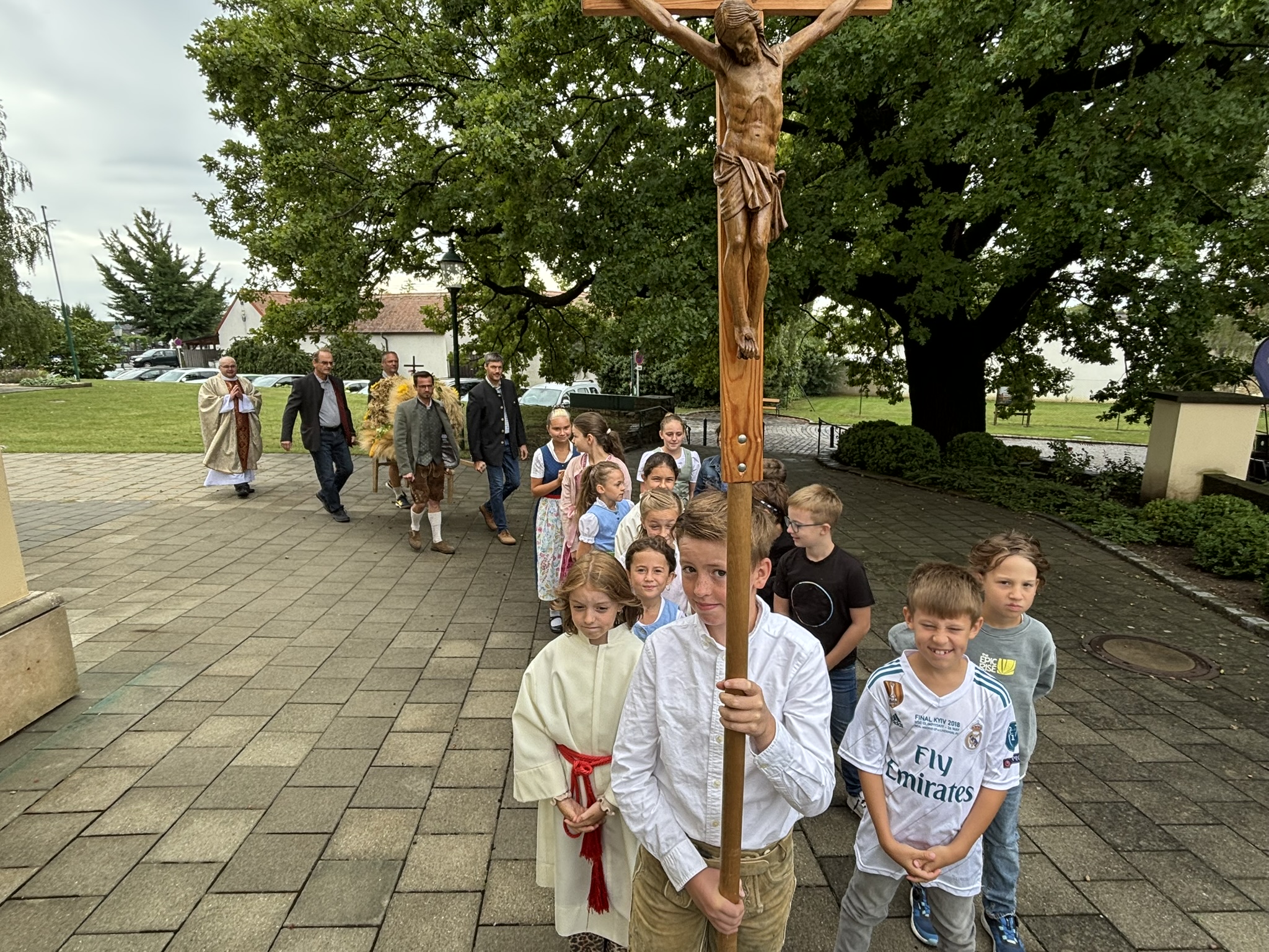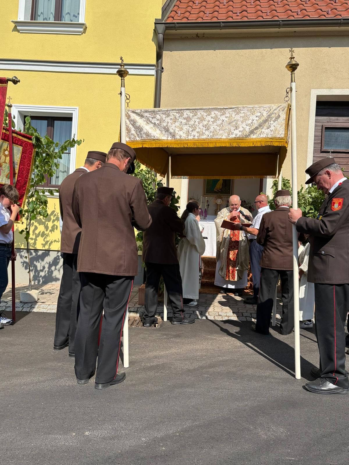 Bei schönem Sommerwetter fand wieder die jährliche Prozession durch den festlich geschmückten Ort statt. Sämtliche Generationen, von Kleinkindern im Kinderwagen bis Senior*innen im Feuerwehr-Begleitfahrzeug, haben and diesem Festumzug teilgenommen. Die Jugendblasmusik Göttlesbrunn-Arbesthal sorgte wieder für die musikalische Umrahmung. Auch eine Premiere hat es dieses Jahr gegeben: die Festlieder wurden diesmal von drei (sehr schöne) Sängerinnen angestimmt.