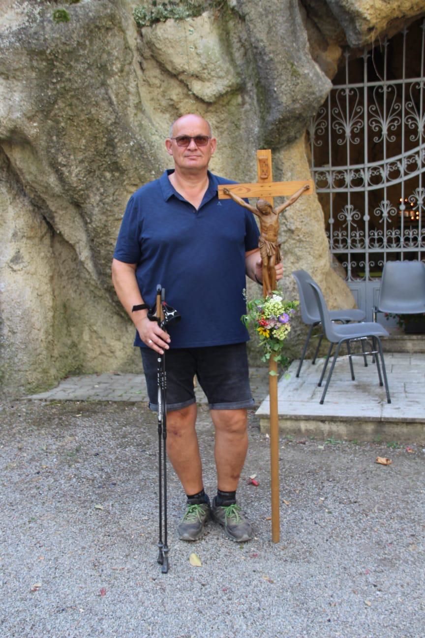 Hansi Taferner vor Grotte Maria Ellend mit Wallfahrtskreuz der Pilgergruppe Göttlesbrunn (Foto Pfarre Gö)
